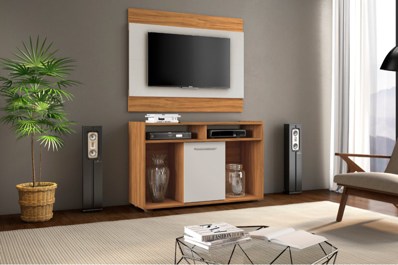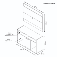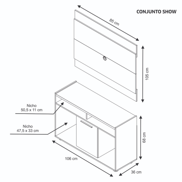 RACK Altura: 680 mm Largura: 1060 mm Profundidade: 360 mm PAINEL Altura: 850 mm Largura: 1050 mm Profundidade: 35 mm Peso: 32 kg Volume: 01 caixa Capacidade de TV: 43″