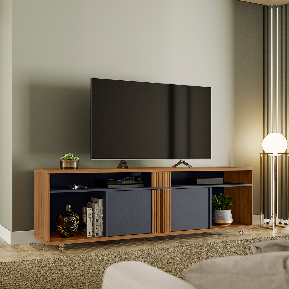 Altura: 590 mm Largura: 1800 mm Profundidade: 380 mm Peso: 41 kg Volumes: 01 caixa Cubagem: 0,097 Capacidade de TV: 60” DIFERENCIAIS: • Rodízios de silicone • Detalhe ripado em MDF • Estrutura de 15 e 25mm • Dobradiças com amortecedor